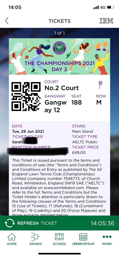 A friend and I had plans to go in 2020. We got chatting as the tournament ended in 2019, and decided to go in 2020. We even had a hotel booked, and we were planning on queuing again. And then Covid happened, and the 2020 Championships were cancelled. Buying tickets was very different this year. The ongoing uncertainty about crowd capacity at big events meant that the AELTC couldn’t confirm numbers until only a couple of weeks before the tournament was due to start. Tickets could only be purchased online, and they didn’t release them until about 10 days before it started. Fortunately I was off work that day…