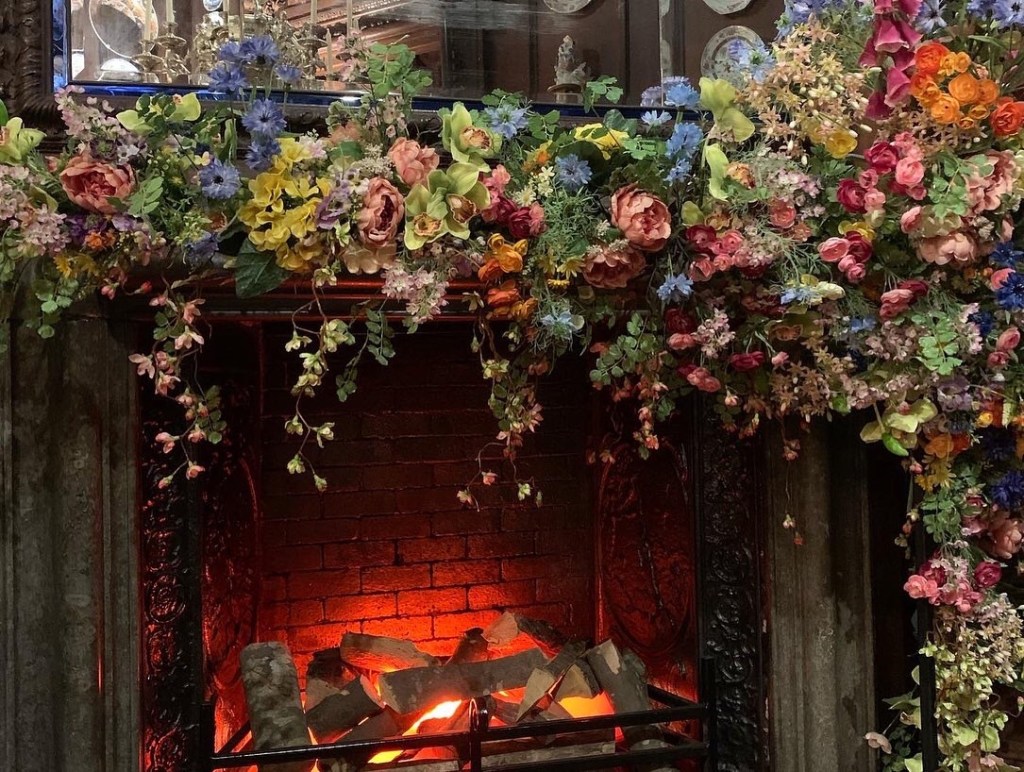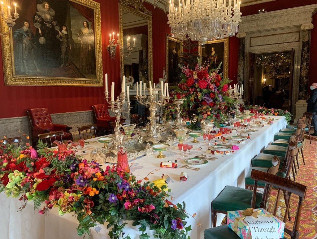 The dining room was set for a large Christmas dinner, with the theme of Christmas through the Ages, with several trees and log fires.