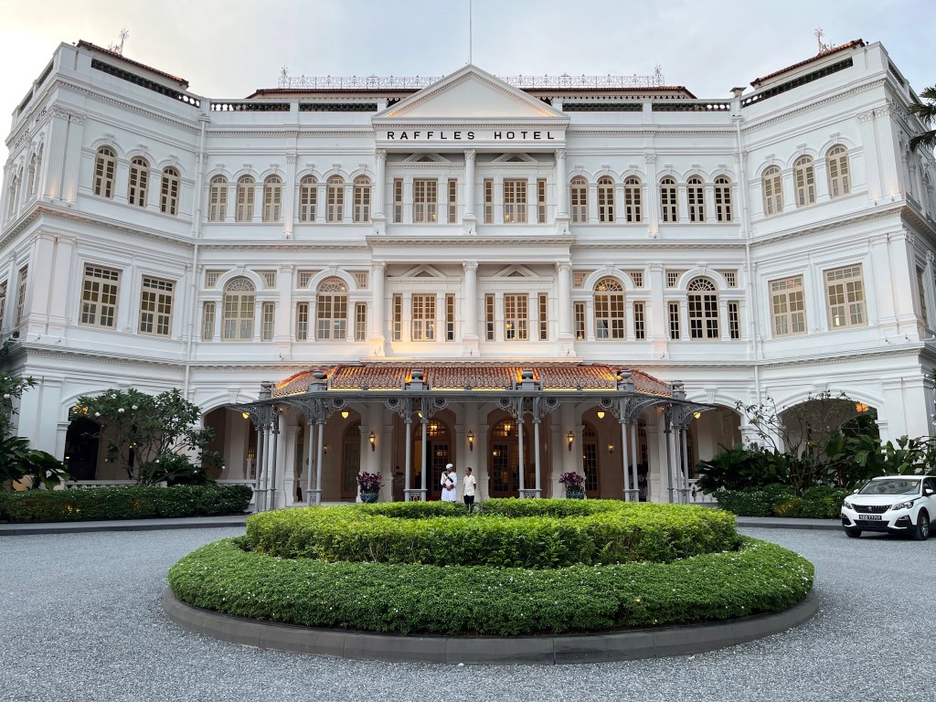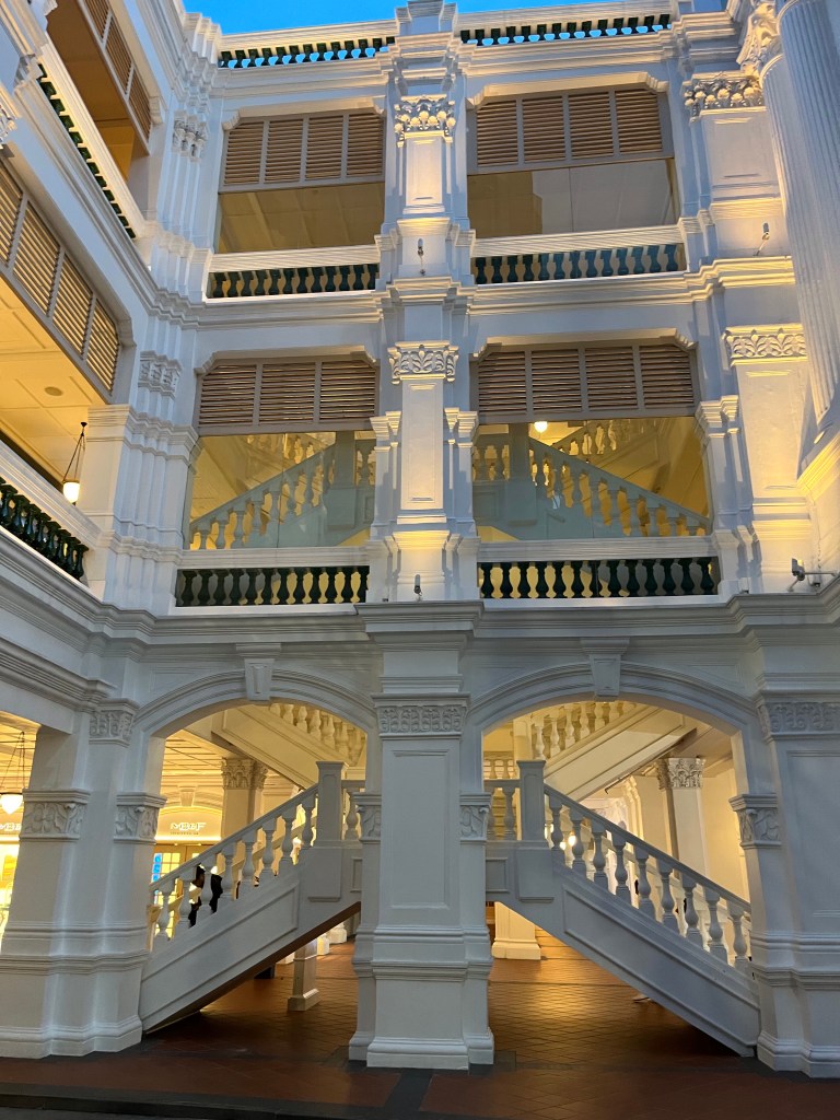 After that, I had a walk around the local neighbourhood, ending up at Raffles Hotel. This is another luxury hotel, but where The Marina Bay Sands is all modern, Raffles oozes old world charm and beauty. It was built in the early 1830s, and was originally a beach house, eventually becoming a hotel, Emerson’s Hotel in 1878. That was a short lived venture, closing after the death of the person who had leased it from the owner in 1883, and was then used a boarding house for a few years after that. But, new people took over the lease from the owner, and The Raffles Hotel opened in 1887. Over the years, it’s been extended and had many new buildings added, and had several renovations and has grown from 10 rooms to todays 115. It’s also no longer on the beach – Singapore uses land reclamation to expand its land, and the seafront is now several miles away. These days, it is a high end luxury hotel, which maintains its original charm – lots of balconies and verandas, and big ornate staircases, and peaceful gardens. Some of these areas are open to the public, as there are no gates but whereas The Marina Bay Sands was busy, Raffles wasn’t, it was lovely and peaceful as night fell.