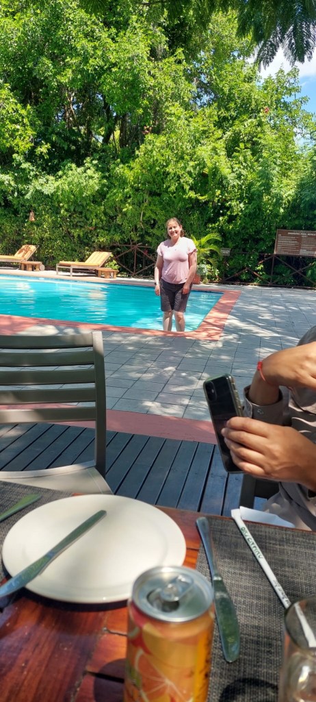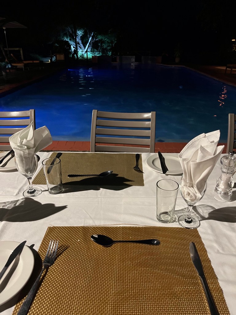 After our 2 nights camping on the Okavango Delta we had a night in a hotel in Maun. The hotel was lovely, with a pool so we could go swimming, and a bar and restaurant which were right next to the pool. More importantly, the hotel had running water and toilets that flushed!